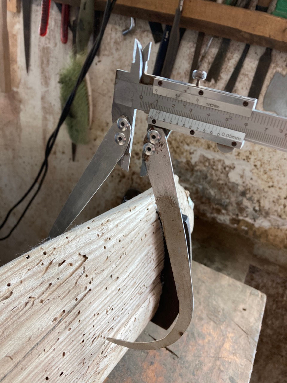 在木板上,畫好範圍,邊度可以挖,過了邊條線就唔好挖,邊畫邊講。跟著容老師用機器把要挖的木𠝹出直線,𠝹的深度是可刮的底線,又𠝹橫線,造成整齊的長方格,方便用學生用槌手鑿。容老師作學生時,老師教用工具手鑿,現在有機器,方便快捷,同樣達到目標,又不損壞木板,省下時間和功夫來做別的事情。完成後,容老師又度下木的厚度,準。
